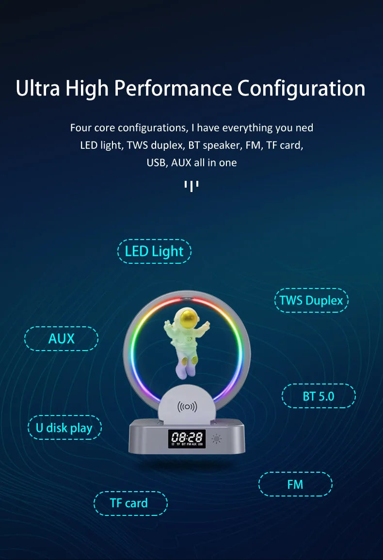 Blast off into an extraordinary audio experience with the AstroBeat Glow, a mesmerizing floating astronaut Bluetooth speaker that combines cutting-edge magnetic levitation technology with premium sound quality. This unique space-themed speaker creates a captivating visual display while delivering crystal-clear audio, making it the perfect centerpiece for any room or the ultimate gift for space